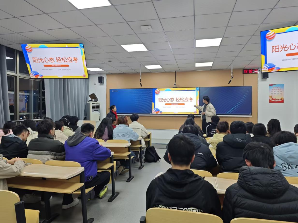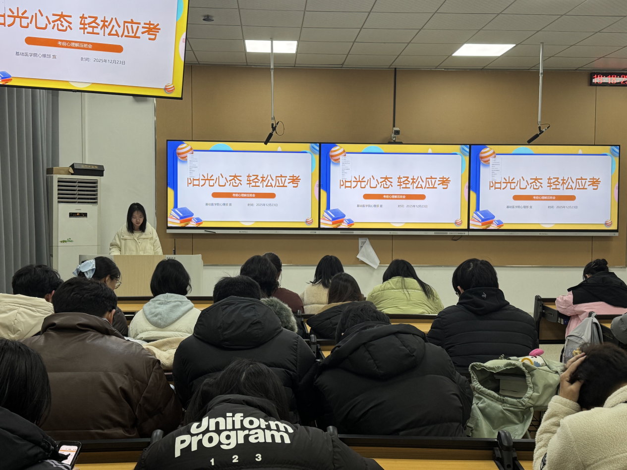 为帮助学生缓解备考压力,以积极心态迎接期末考试,2025年12月28日,基础医学院面向全院组织开展了“阳光心态,轻松应考”考前心理减压主题班会。各班心理委员牵头策划,通过专业讲解、互动体验与朋辈分享等多种形式,为同学们提供了实用的心理调适方法。